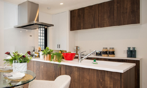 開放感を保ちながら空間にメリハリを創るペニンシュラキッチン。デザイン性と機能性を兼ね備えたキッチンです。