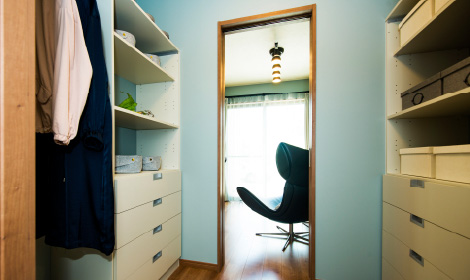 家族全員の衣類や小物をまとめて収納できるファミリークローゼット。柔軟性の高い収納があると居室空間をスッキリと保てます。