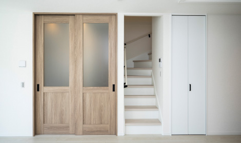 天井まで届くハイドアは、空間を垂直方向に大きく見せ、開放感を演出。無駄なラインをなくすことで、すっきりとしたデザインに仕上がります。