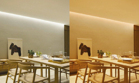 間接照明は昼白色と電球色の調色が可能。調光と共に生活シーンにあったライティングを楽しめます。
