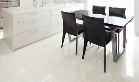 美しい鏡面仕上げを施した石目調の床材をエントランスに配置。モダンで品のある空間を演出するマテリアルです。